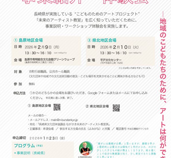長崎県が実施している“こどものためのアートプロジェクト”「未来のアーティスト教室」を広く知っていただくために、事業紹介・ワークショップ体験会を実施します。
