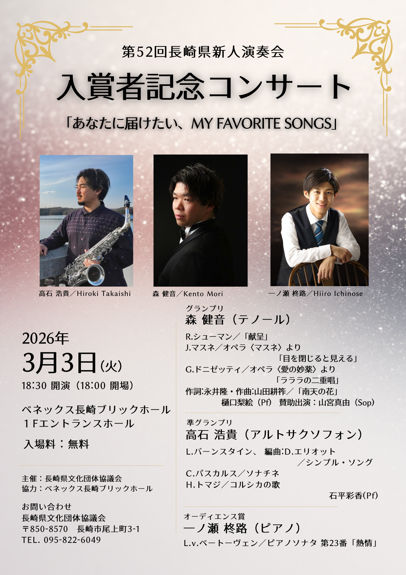 令和7年10月に実施した「第52回長崎県新人演奏会」において、グランプリ・準グランプリ・オーディエンス賞を受賞した入賞者3名による「入賞者記念コンサート」を開催します。